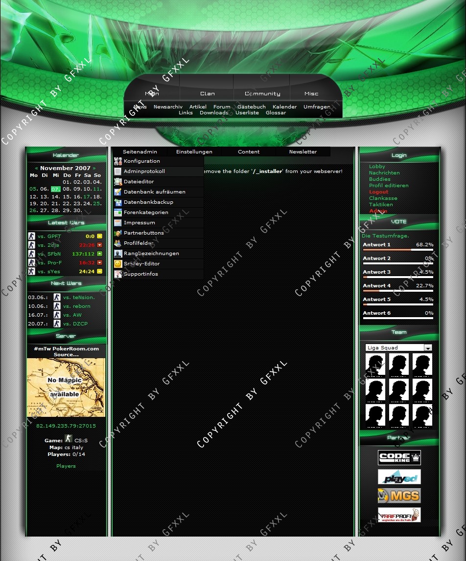 Wir sind mit unserem Templete von ClanDesigns.org und CodeKing.eu voll und ganz zufrieden. Alle unsere Änderungswünsche sind sehr gut gelungen und die Installation war ein Kinderspiel. Der Support ist genial schnell, freundlich und echt nicht aus der Ruhe zu bringen :-) Super schnelle und gute Lösung für jeden Clan der sich von der Masse abheben will.